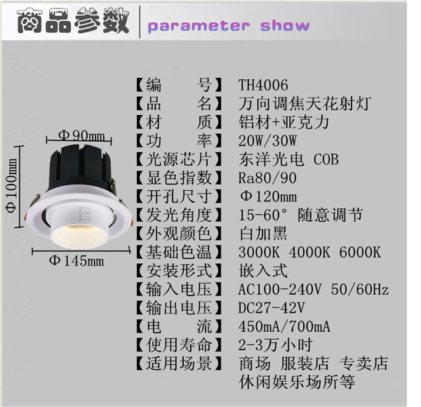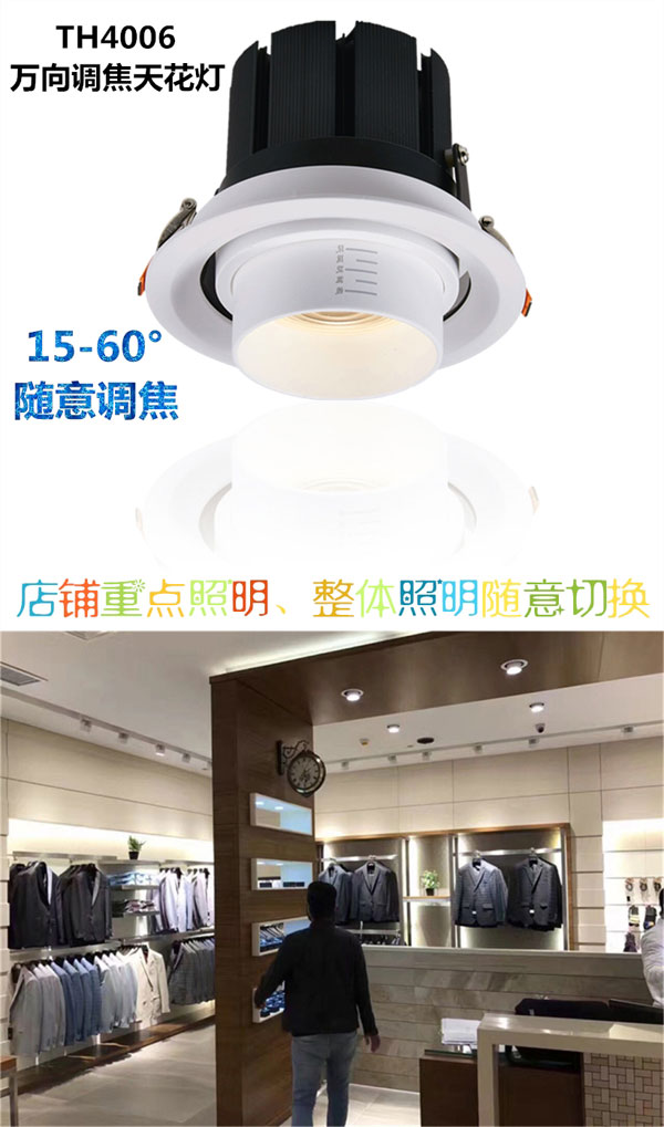 5、調(diào)焦天花燈適用于服裝店、博物館、展廳、商店照明、汽車(chē)陣列室、品牌專(zhuān)賣(mài)店、等一切場(chǎng)所。