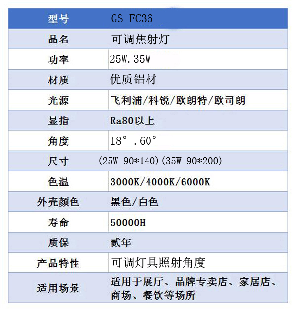 3、可調(diào)焦射燈GS-FC36搭載原裝進(jìn)口光源、驅(qū)動(dòng)。LED燈具顯色性強(qiáng),逼真程度高;