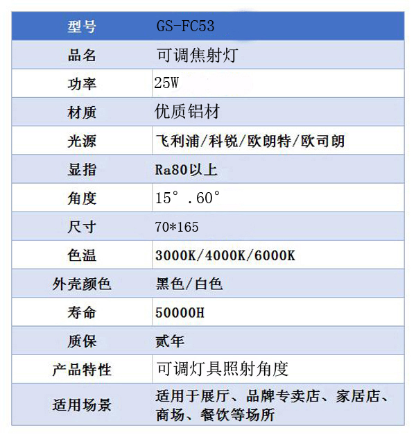 3、可調(diào)焦射燈GS-FC53搭載原裝進(jìn)口光源、驅(qū)動。LED燈具顯色性強(qiáng),逼真程度高;