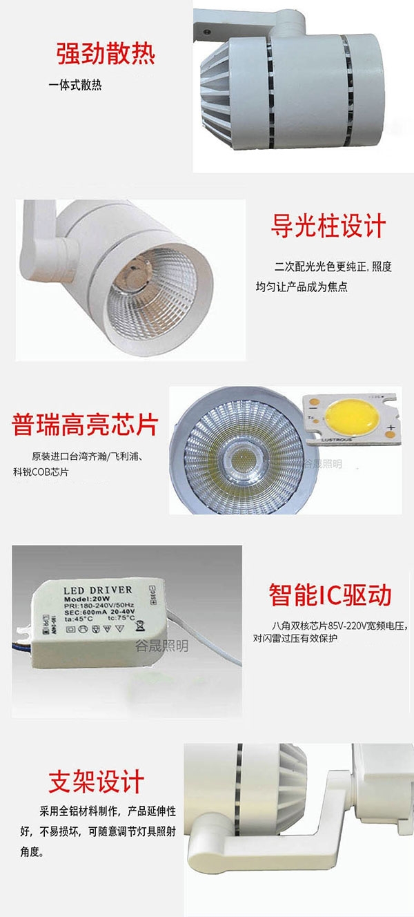 3、20wcob導(dǎo)軌射燈GS-SP228采用原廠COB技術(shù)封裝的LED光源,散熱效果佳,光色柔和純正;