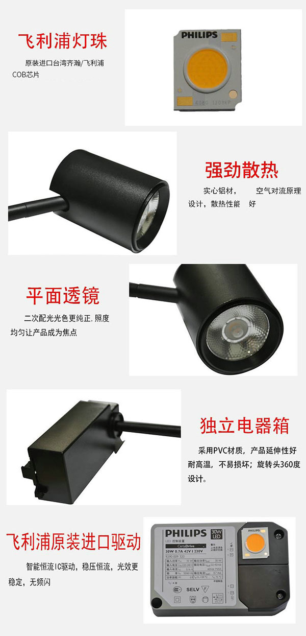 3、cob導(dǎo)軌射燈GS-D204采用COB技術(shù)封裝的LED集成光源,散熱效果佳,光色柔和純正;