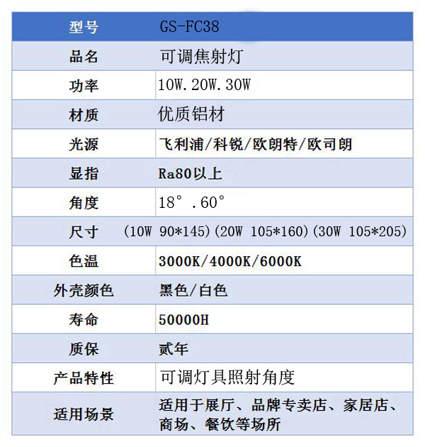 3、可調(diào)焦射燈GS-FC38搭載原裝進口光源、驅(qū)動。LED燈具顯色性強,逼真程度高;